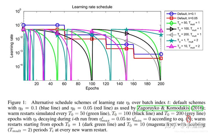 功能: 以余弦函数为周期,并在每个周期最大值时重新设置学习率。《 SGDR: Stochastic Gradient Descent with Warm Restarts》(ICLR-2017)