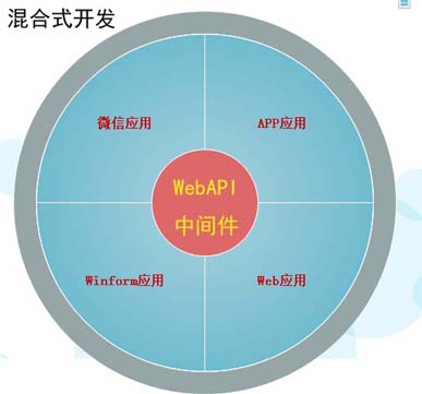 关键时刻,“混合式开发”(见下图)闪亮登场。所谓的”混合式开发”就是使用HTML5作为开发应用前端界面的主力技术,使用原生开发语言作为实现应用程序内部功能和逻辑的技术,然后将两者进行结合。Web服务端中间件集成WebAPI,提供给各种应用平台如微信平台、WEB接入、APP及Winform访问,大幅度的提升应用程序针对不同平台的适应性,降低应用程序的开发工时及开发成本。理论分析及实践应用都证明:”混合式开发”是未来软件开发的主流框架。当前,很多编程语言都朝“混合式开发”方向发展。