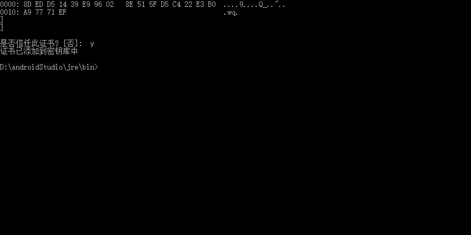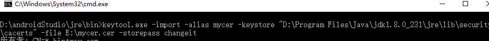 5.执行命令:keytool -import -alias mycer -keystore "D:\Program Files\Java\jdk1.8.0_231\jre\lib\security\cacerts" -file E:\mycer.cer -storepass changeit