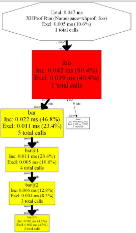 Incl.:为 Including 包含的简写; Excl.:为 Excluding 不包含的简写 Wall Time:意为挂钟时间即任务花费的时间 main():一个虚构的函数,程序根节点 bar@2:递归调用 2 次