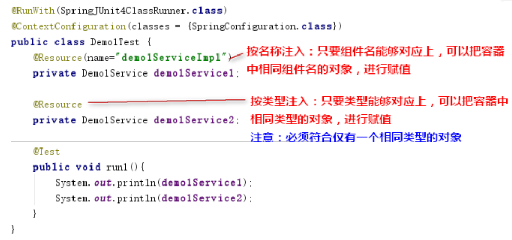 向spring工厂加载配置类,并开始使用spring管理对象 固定结构: @ContextConfiguration(classes={SpringConfiguration.class}) |