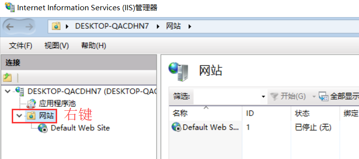 右击网站 ,可以添加站点。但是一般没这个必要。直接可以把自己的项目部署到 Default Web Site即可。如何部署?看下面详解: