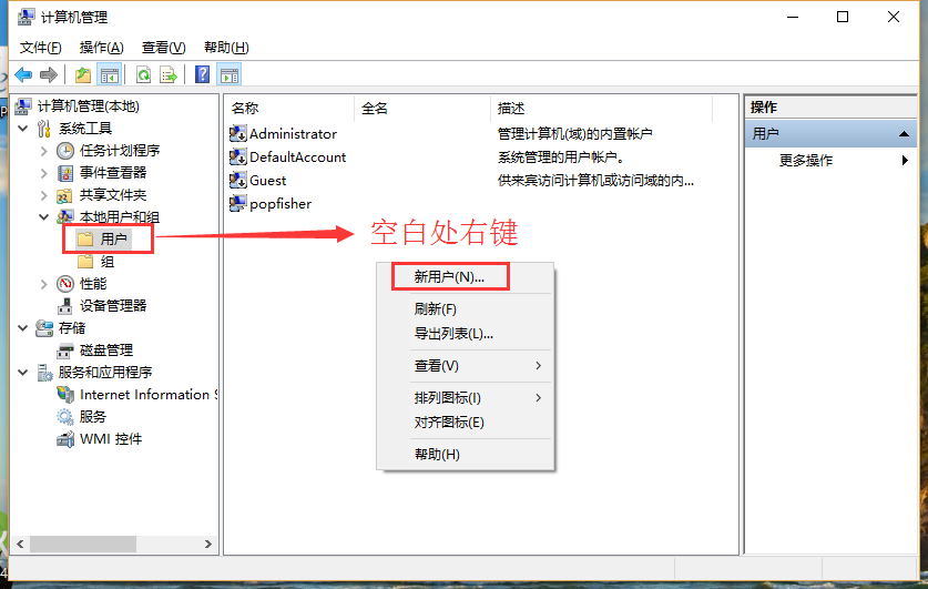 3.4.2 此电脑(桌面计算机图标右键)—>管理->本地用户和组->用户->新建一个用户,并设置密码