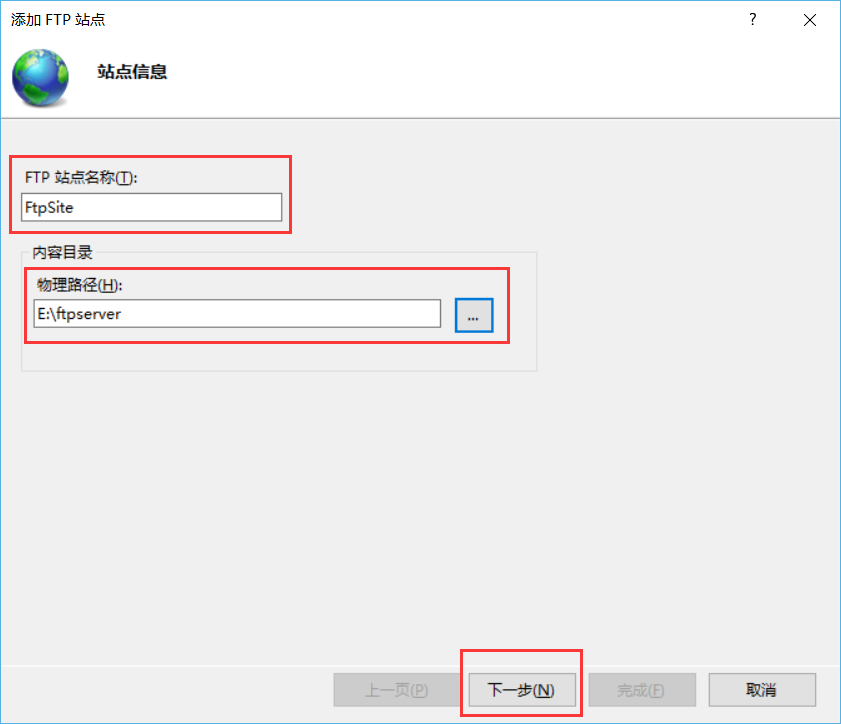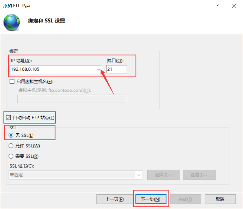 2.2.5 配置网站(网站名称:FtpSite 物理路径:E:\ftpserver 本机IP地址(从下拉菜单选择):192.168.0.105)