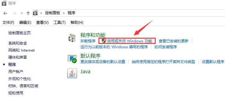1.2 程序界面找到“启用或关闭Windows功能”并打开