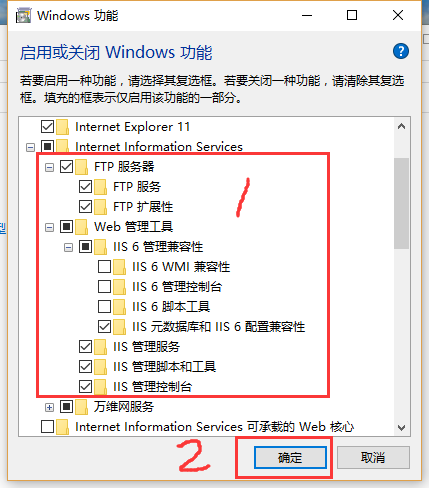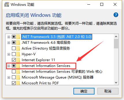 1.4 从“启用或关闭Windows功能”弹窗中找到Internet Information Services(或者中文版Internet信息服务)并打开