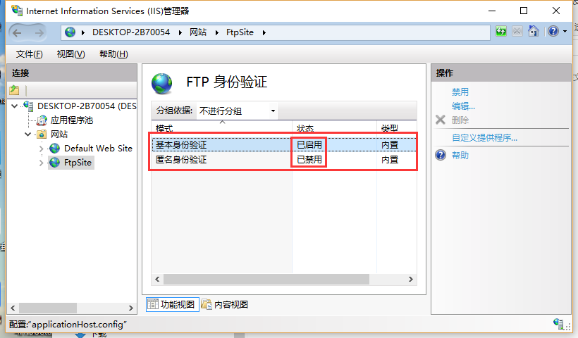 3.4.1 IIS管理器中的FTP身份验证里面配置禁用匿名身份认证同时启用基本身份认证(再次访问就会要求输入用户名和密码)
