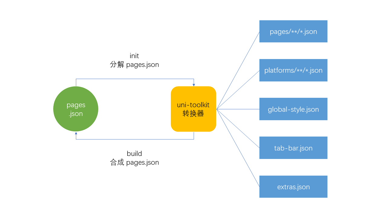 pages.json文件,生成单个页面的配置文件。 - 能拆还要能建,根据分解后的配置文件重新组合成