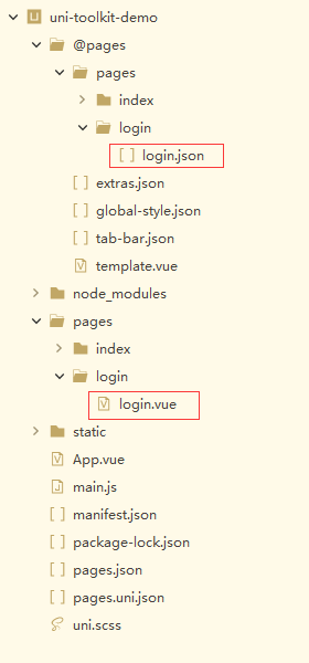 @pages目录用于存放 uni-toolkit 分解pages.json后生成的配置集。pages.uni.json用于备份最初的pages.json文件。