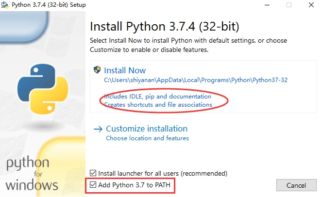 (2)执行下载的pyhon软件安装。勾选"Add Python3.7 to Path"。其他一路Next安装完成。默认会安装一键式工具pip。
