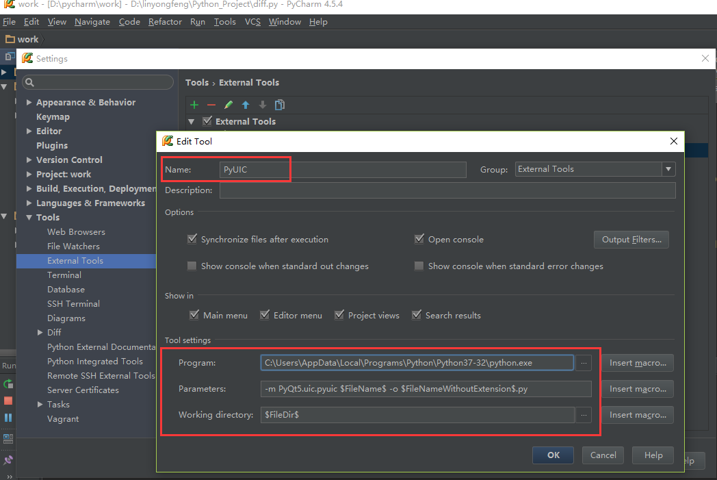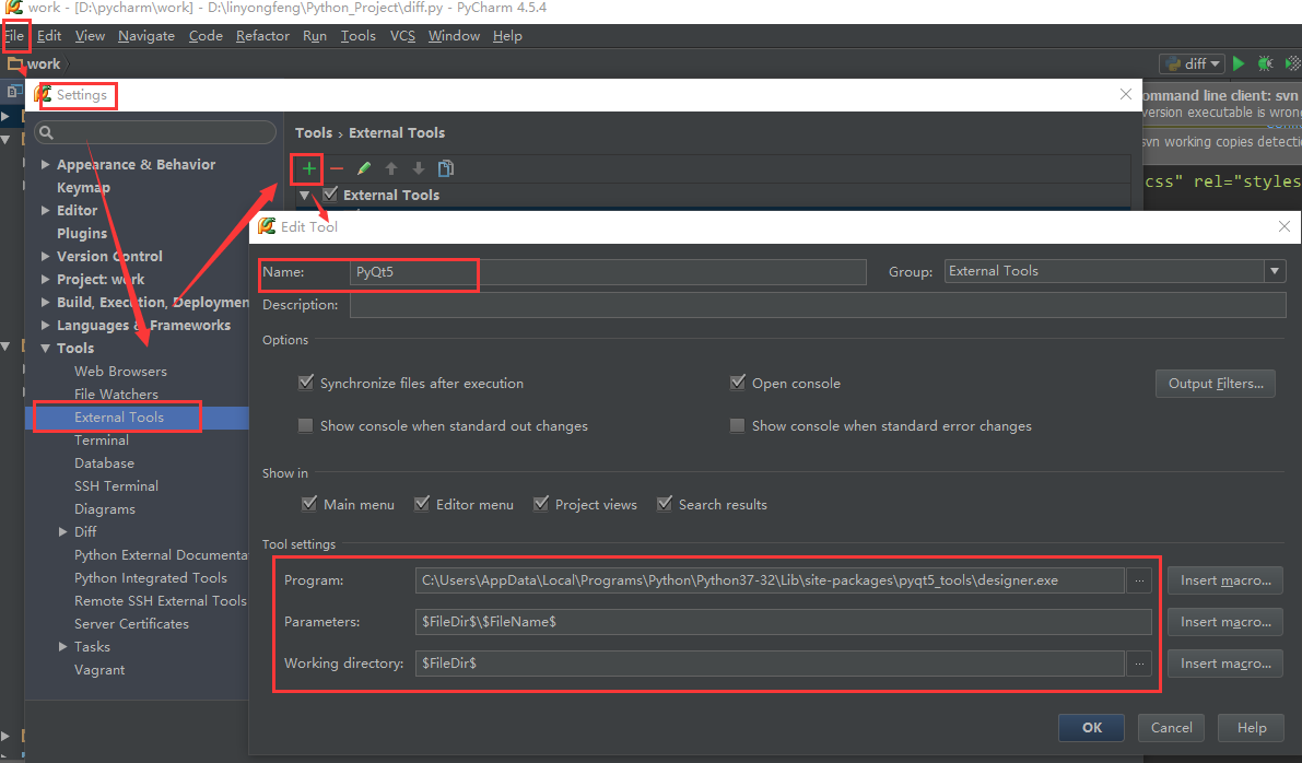 (1)配置Qt Designer。PyCharm -> 菜单File -> Settings -> Tools -> External Tools -> +号,进行添加。 参数配置说明: