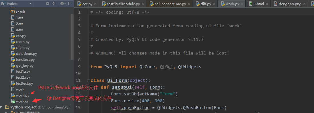 打开PyUIC,自动完成work.ui文件的转换。生成文件名为work.ui。