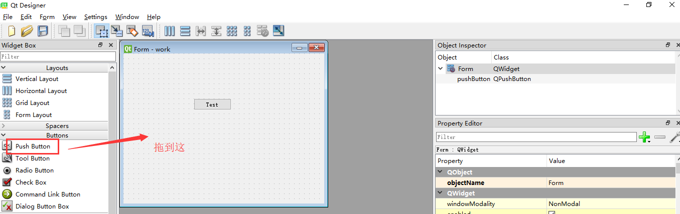 点击Qt Designer,打开Designer程序主界面如下。将左侧Widget Box中Push button空间拖到主界面,双击空间修改名称为test。另存为名称work.ui。默认后缀就是.ui。