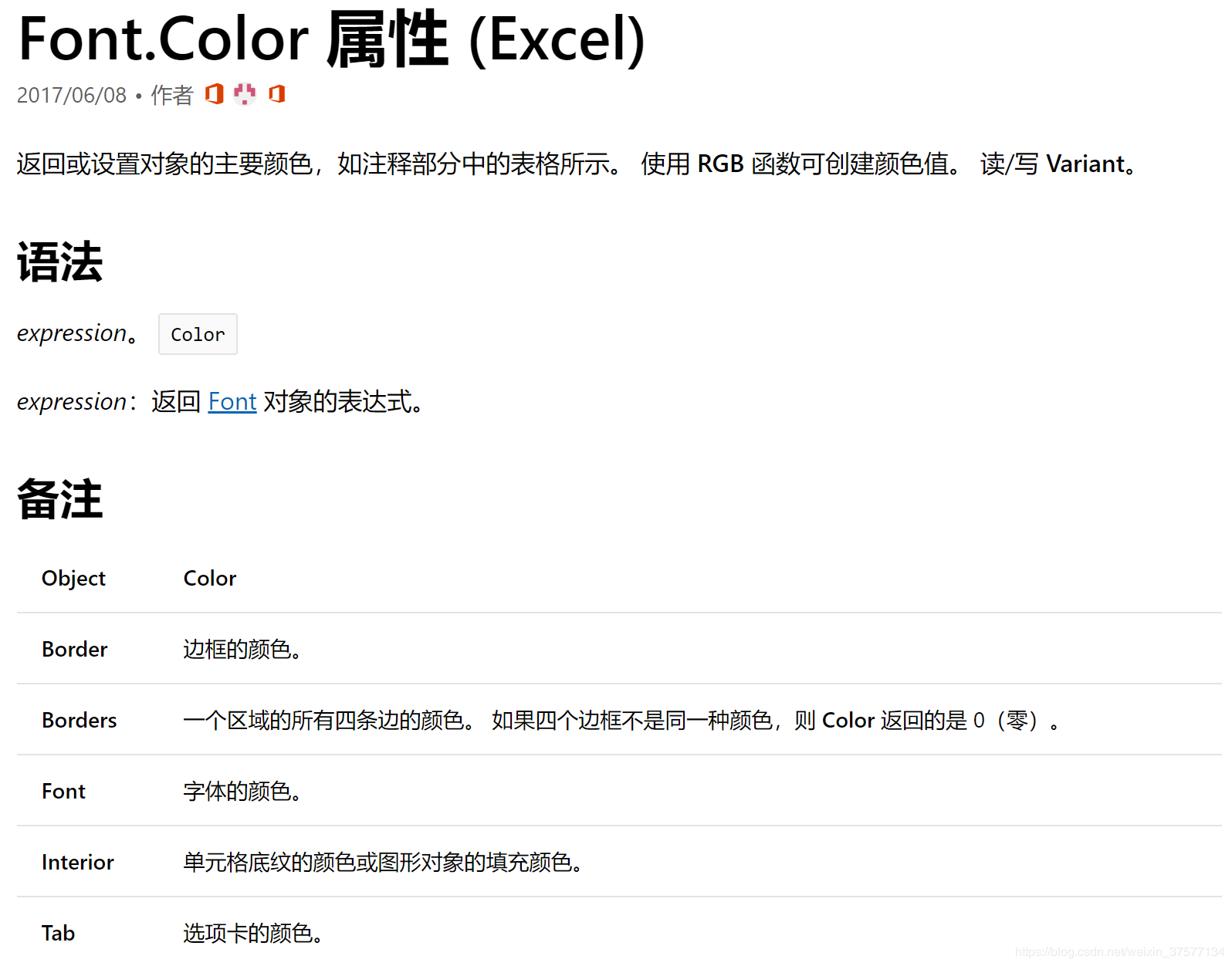 看到这句话,再结合@RobbenEmi 的博文[3],我去微软官网查看了一下office VBA参考中的Font.Color方法