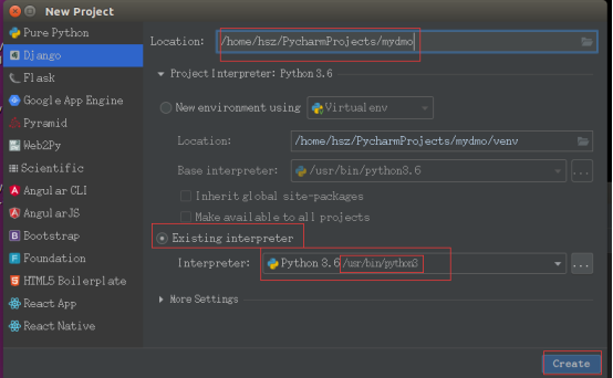 进入pycharm-file ---> new project ---->选择Django ---> 配置路径和项目名称 ---> 配置环境(默认用系统环境)即在Existing interpreter 中找到环境目录导入 ----> 点击create(完成创建)
