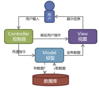 Web服务器开发领域里著名的MVC模式,所谓MVC就是把Web应用分为模型(M),控制器(C)和视图(V)三层,他们之间以一种插件式的、松耦合的方式连接在一起,模型负责业务对象与数据库的映射(ORM),视图负责与用户的交互(页面),控制器接受用户的输入调用模型和视图完成用户的请求,其示意图如下所示: