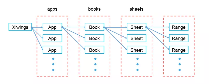 在xlwings中,有四种主要的对象类型,按递减的层次顺序排列:App(代表一个Excel实例)、Book、Sheet和Range。除了这些之外,我们还将处理Chart和Shape对象。