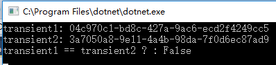 var transient1 = provider.GetService<IOperationTransient>(); Console.WriteLine($"transient1: {transient1.OperationId}"); var transient2 = provider.GetService<IOperationTransient>(); Console.WriteLine($"transient2: {transient2.OperationId}"); Console.WriteLine($"transient1 == transient2 ? : { transient1 == transient2 }");