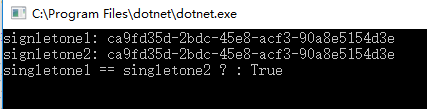 // 自定义传入Guid空值 services.AddSingleton<IOperationSingleton>( new Operation(Guid.Empty)); // 自定义传入一个New的Guid services.AddSingleton <IOperationSingleton>( new Operation(Guid.NewGuid())); var provider = services.BuildServiceProvider(); // 输出singletone1的Guid var singletone1 = provider.GetService<IOperationSingleton>(); Console.WriteLine($"signletone1: {singletone1.OperationId}"); // 输出singletone2的Guid var singletone2 = provider.GetService<IOperationSingleton>(); Console.WriteLine($"signletone2: {singletone2.OperationId}"); Console.WriteLine($"singletone1 == singletone2 ? : { singletone1 == singletone2 }");