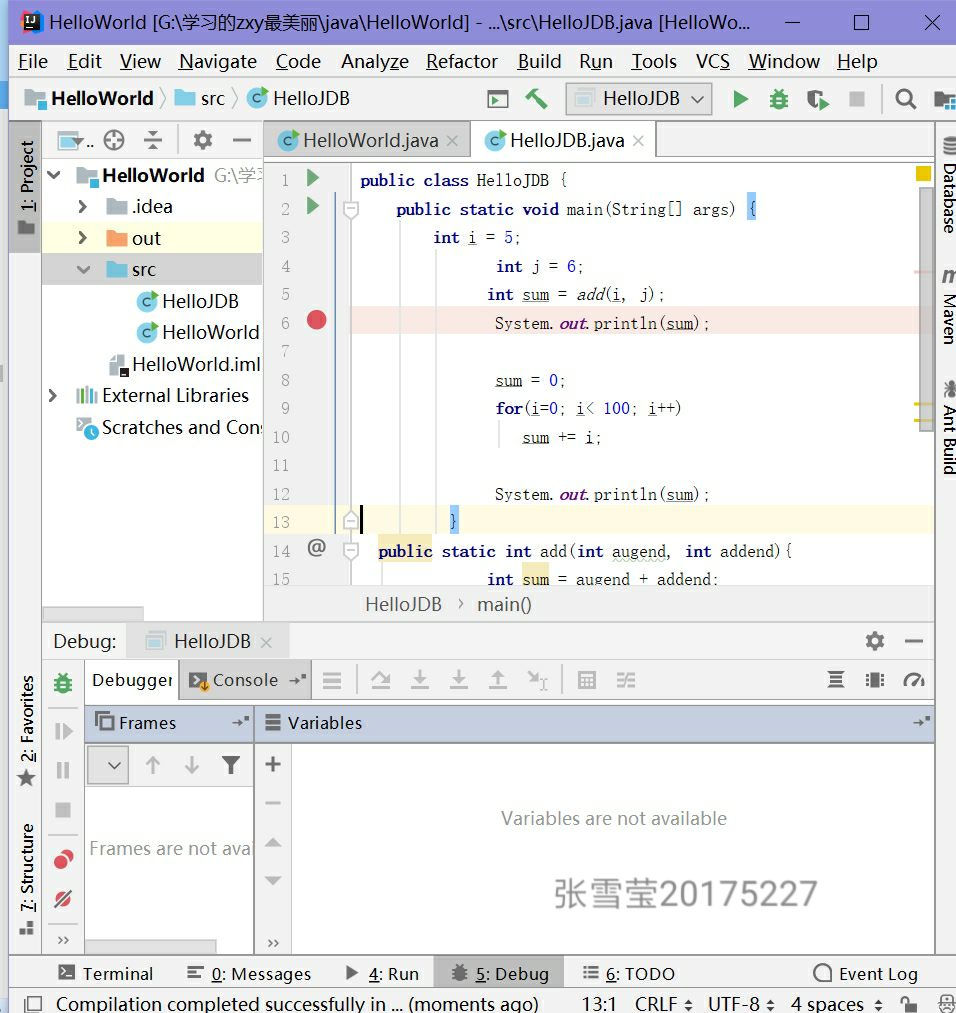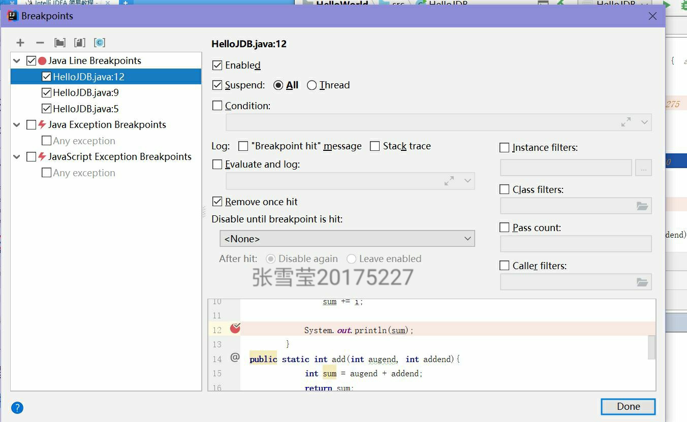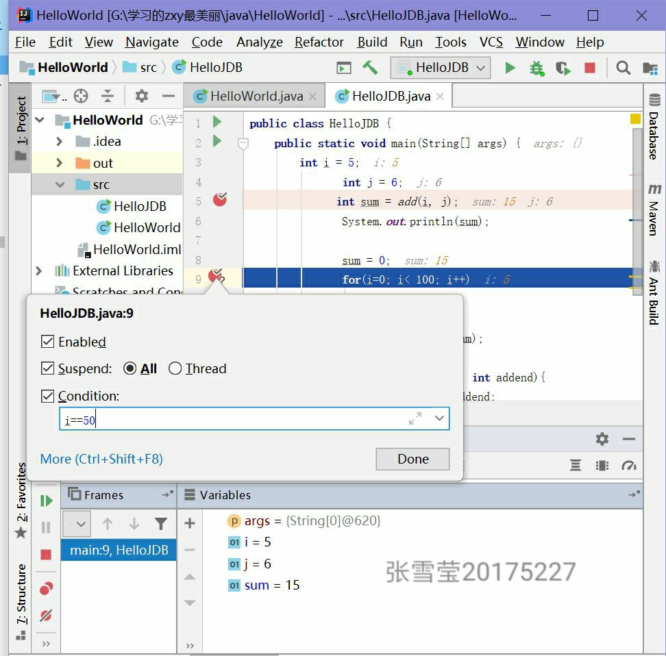 - 提交IDEA中调试设置条件断点的全屏截图,截图打上自己学号的水印。
