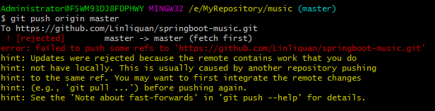 出现问题的原因:在github上更新了README.md,没有更新到本地仓库。而在本地git仓库又修改了文件,这时使用 git push origin master 推送到远程仓库后就出现了下面的问题: