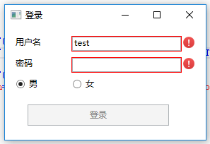 到目前为止,登录窗口的基本功能似乎都完成了。但我们知道,很多时候用户名的格式是有要求的,例如是只有字母数字下划线,或者字数有限制。这要求我们在登录之前,验证输入内容的正确性。在这一节,我们需要验证用户名和密码的正确性,如果上面两个框的输入非法,禁用登录按钮。