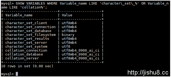 SHOW VARIABLES WHERE Variable_name LIKE 'character\_set\_%' OR Variable_name LIKE 'collation%';