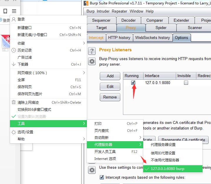 端口可自定义,接着浏览器设置代理,要与burp设置的一致。以360浏览器为例。