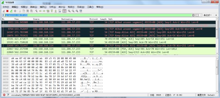 过滤器处输入:ip.dst==111.206.57.233——查找目的地为目标IP的数据