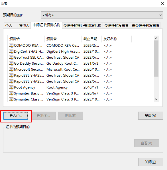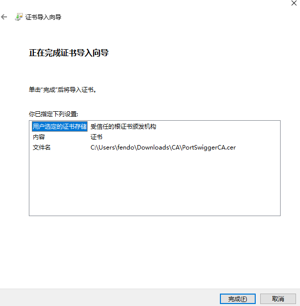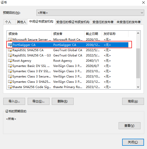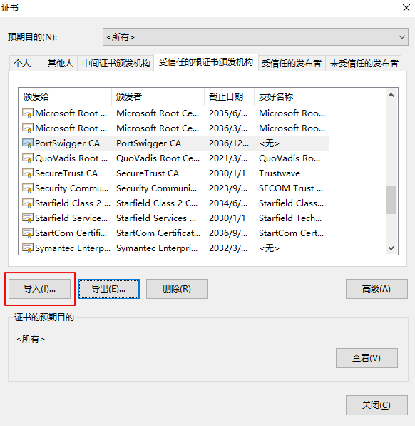 --->点击管理证书,所有浏览器在安装PortSwiggerCA.crt证书时,必须安装到“受信任的根证书颁发机构”中