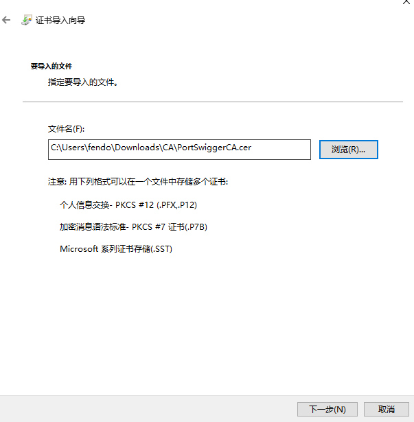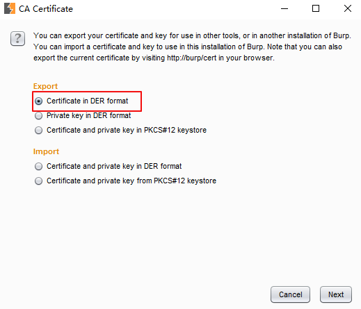 注意思路,burp提供的是der格式的证书,必须得先导入到浏览器,然后从浏览器在导出cer格式的证书