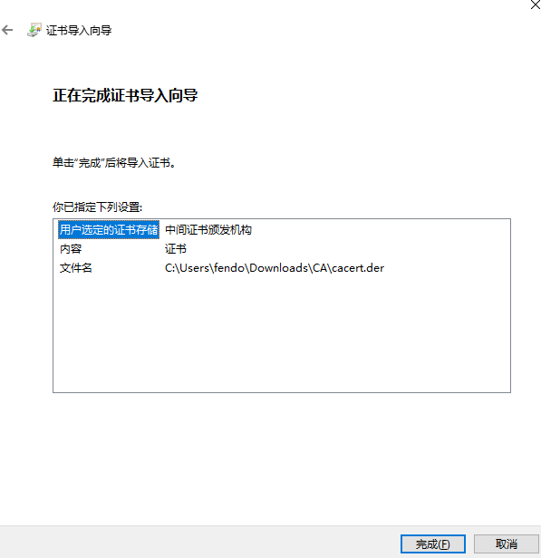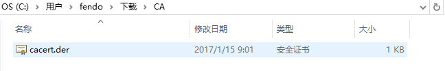 证书是cacert.der,后缀名是.der文件(证书的编码方式不一样),这个文件不是常规的.cer的证书文件,下面就是让浏览器信任我们刚才导出的证书。