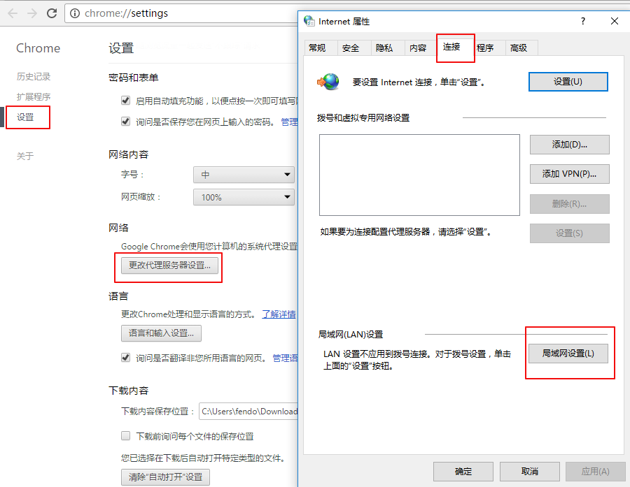 拿Chrome为例: 设置---->显示高级设置---->网络---->更改代理服务器设置