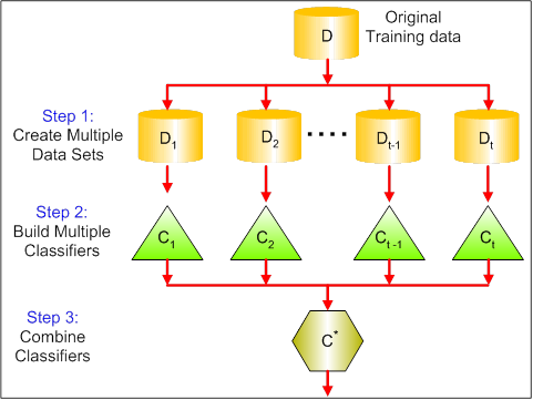 文中举了一个垃圾邮件检测的例子,简单来说就是,仅凭单个规则很难准确识别垃圾邮件,但是使用多条规则会提高识别的准确率。这个例子是为了说明,ensemble learning是一个“多合一”的方法。“多”指的是多个个体模型(individual models),注意,并非是多个独立模型;“合一”指的是多个模型共同形成一个识别/回归结果。Ensemble的一般特点是,多个模型间的相关性越低,合成之后的识别/回归效果越好。