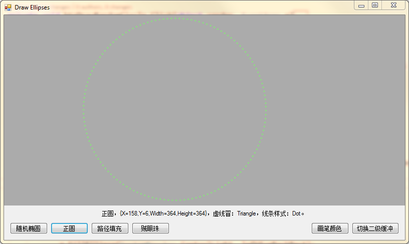 有了上一节画矩形的基础,画圆形就不要太轻松+EZ:)所以,本节在画边线及填充上,就不做过多的讲解了,关注一下画“随机椭圆”、“正圆”、“路径填充”的具体实现就好。与画矩形相比较,画椭圆与之完全一致,没有任何特别之处。