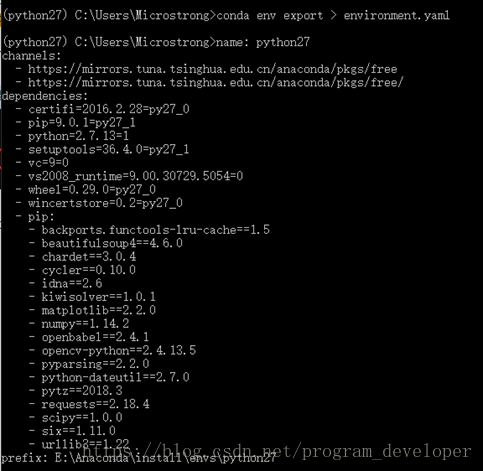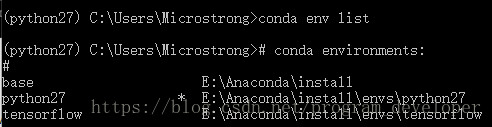 上面的命令中,python27是设置环境的名称(-n是指该命令后面的python27是你要创建环境的名称),numpy是你要安装在环境中的包名称。