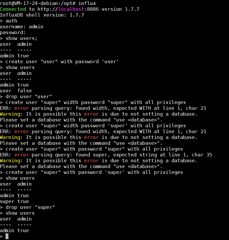 7 create user "admin" with password 'admin' with all privileges