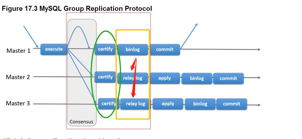 The following figure depicts the MySQL Group Replication protocol and by comparing it to MySQL Replication (or even MySQL semisynchronous replication) you can see some differences. Note that some underlying consensus and Paxos related messages are missing from this picture for the sake of clarity.