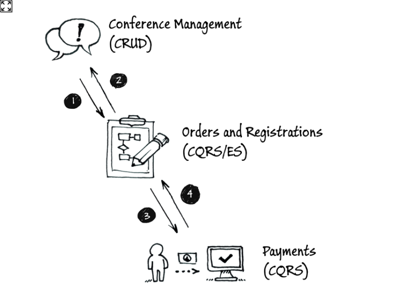 订单和注册限界上下文:在订单和注册限界上下文中包含预订、付款和注册项。当注册用户与系统交互时,系统创建一个订单来管理预订、付款和注册。订单包含一个或多个订单项。<br> <br> 预订是在会议上临时预订一个或多个座位。当注册用户开始订购会议上的一些座位时,系统会为这些座位创建预订。然后,其他用户无法预订这些座位。预订保留15分钟,在此期间,登录人可以通过支付座位的费用完成订购过程。如果用户没有在15分钟内付款,系统将删除该预订,其他用户可以继续预订这些座位。