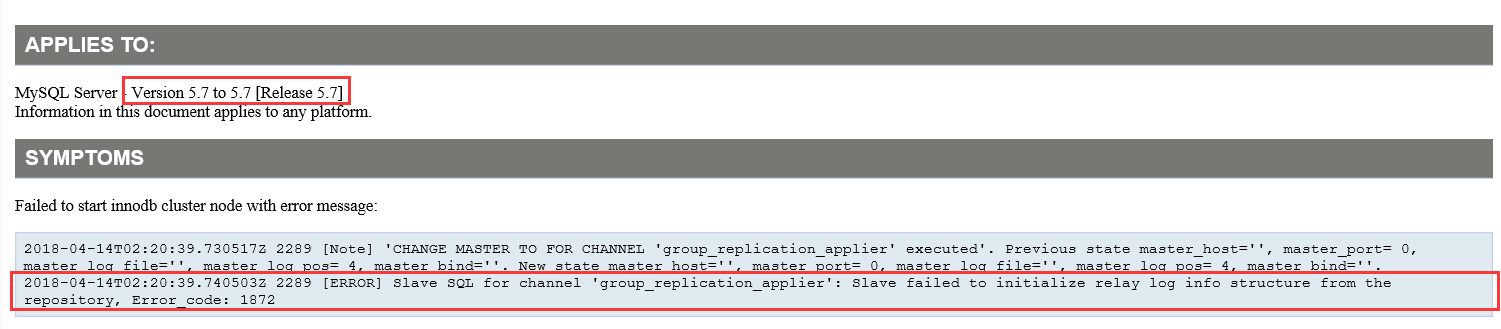 MySQL Innodb Cluster Node Failed To Start With Error: "[ERROR] Slave SQL for channel 'group_replication_applier': Slave failed to initialize relay log info structure from the repository, Error_code: 1872" (文档 ID 2386403.1)