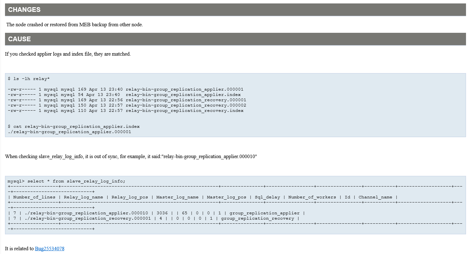 从报错日志查看,数据库在识别relay log时出现问题,从Oracle官方文档可以确认异常终止MGR服务命中了Bug25534078: