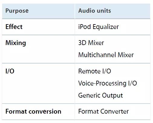 -Audio Units共可分为四大类,並可细分为七种,可参考下表: