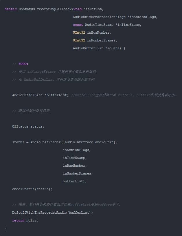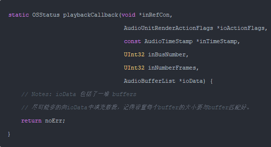 6.使用 AudioUnitSetProperty 设置音频录制与放播的回调函数。