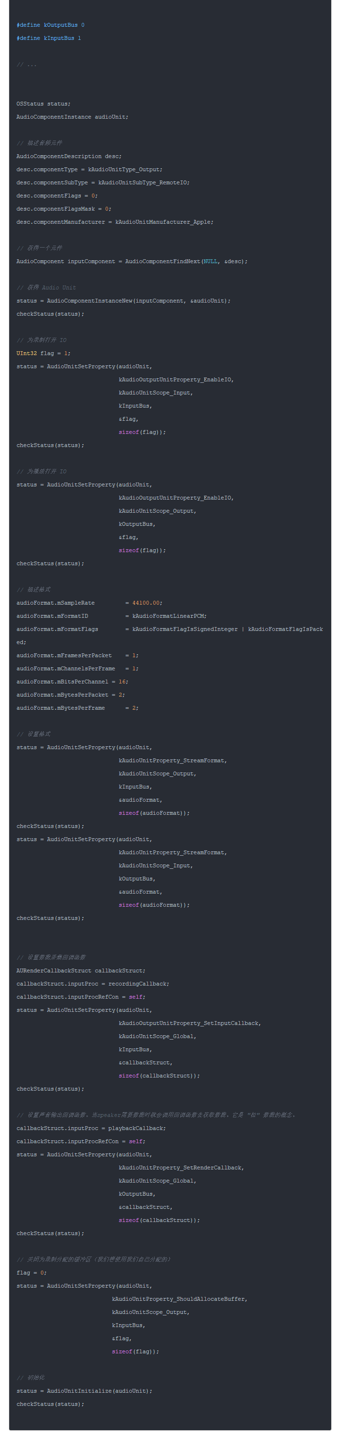 初始化看起来像下面这样。我们有一个 AudioComponentInstance 类型的成员变量,它用于存储 Audio Unit。
