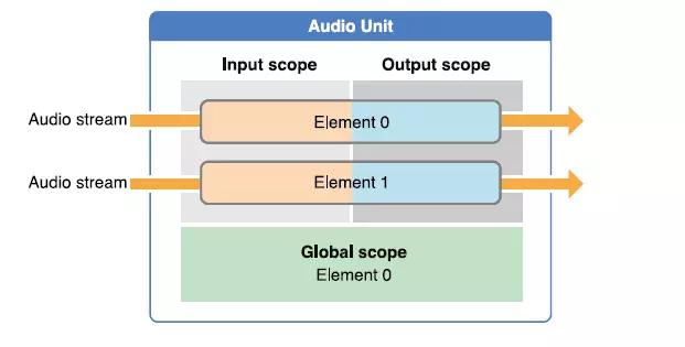 -参考下图,Audio Unit 内部结构分为两大部分,Scope 与Element。其中 scope 又分三种,分別是 input scope, output scope, global scope。而 element 则是 input scope 或 output scope 內的一部分。