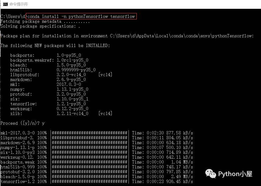 使用命令conda install -n pythonTensorflow tensorflow为名字为pythonTensorflow的虚拟开发环境安装扩展库tensorflow,如下图