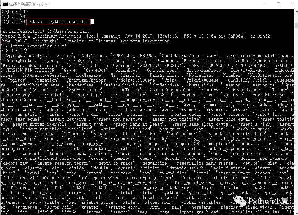 下图演示了另一个虚拟开发环境pythonTensorflow的激活和关闭