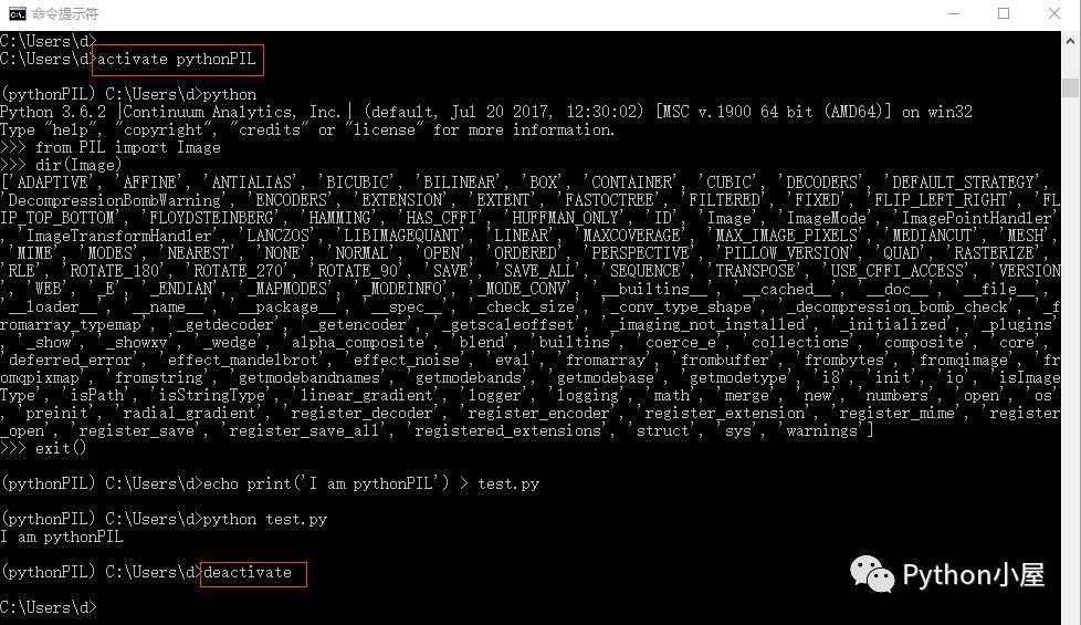 使用命令activate pythonPIL激活虚拟开发环境pythonPIL,进行自己的开发,对于完整的Python程序,可以使用Spyder进行编写,使用结束后使用命令deactivate关闭这个虚拟开发环境,如下图